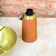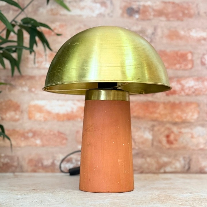 Le support est réalisé en céramique artisanale, offrant robustesse et caractère, tandis que le chapeau est fabriqué en laiton doré finement travaillé, apportant une lumière chaleureuse et raffinée.