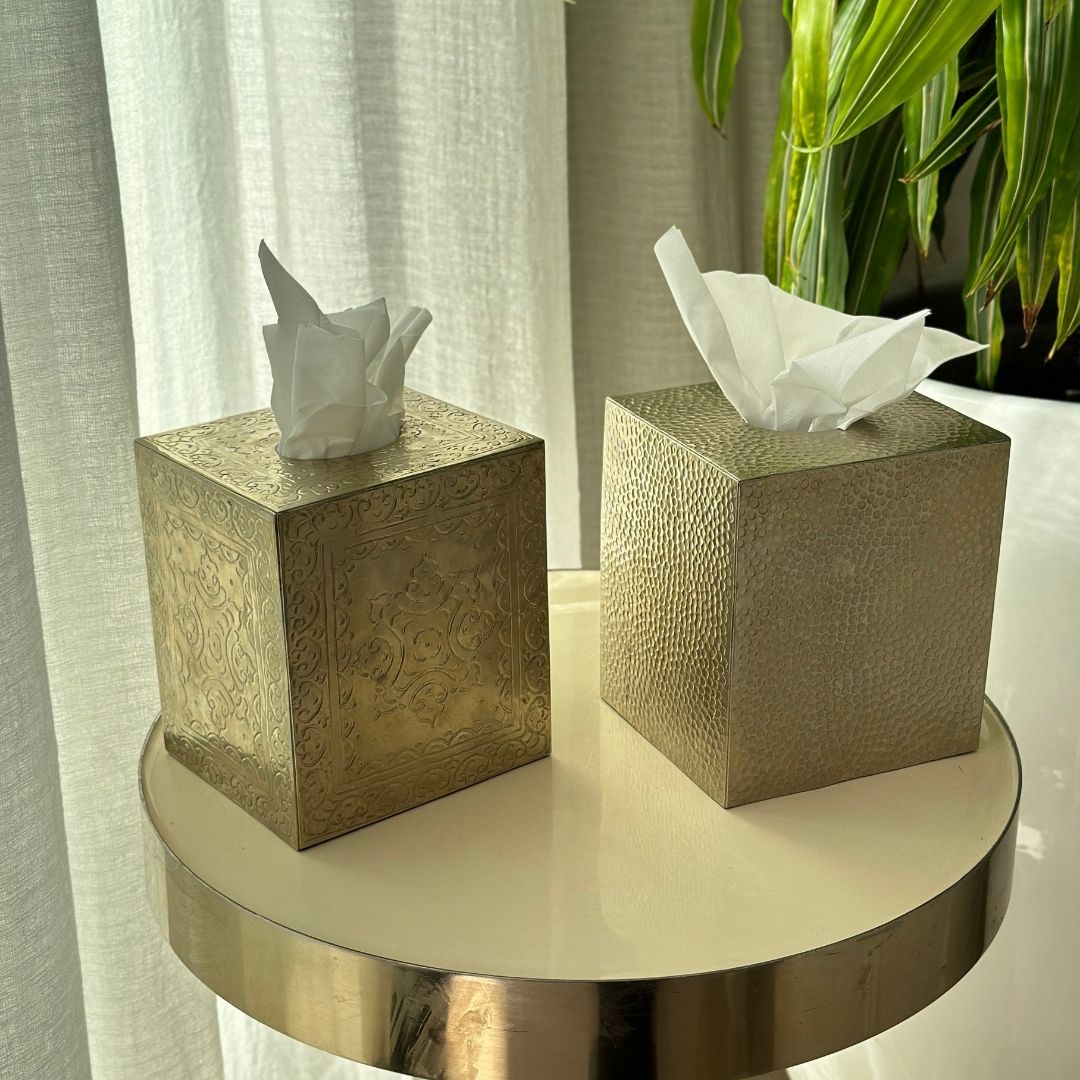 Cette boîte à mouchoirs en métal martelé apportera une touche de luxe à votre maison. Chaque boîte est faite à la main et gravée à la main, ce qui vous donne une pièce unique et classique.