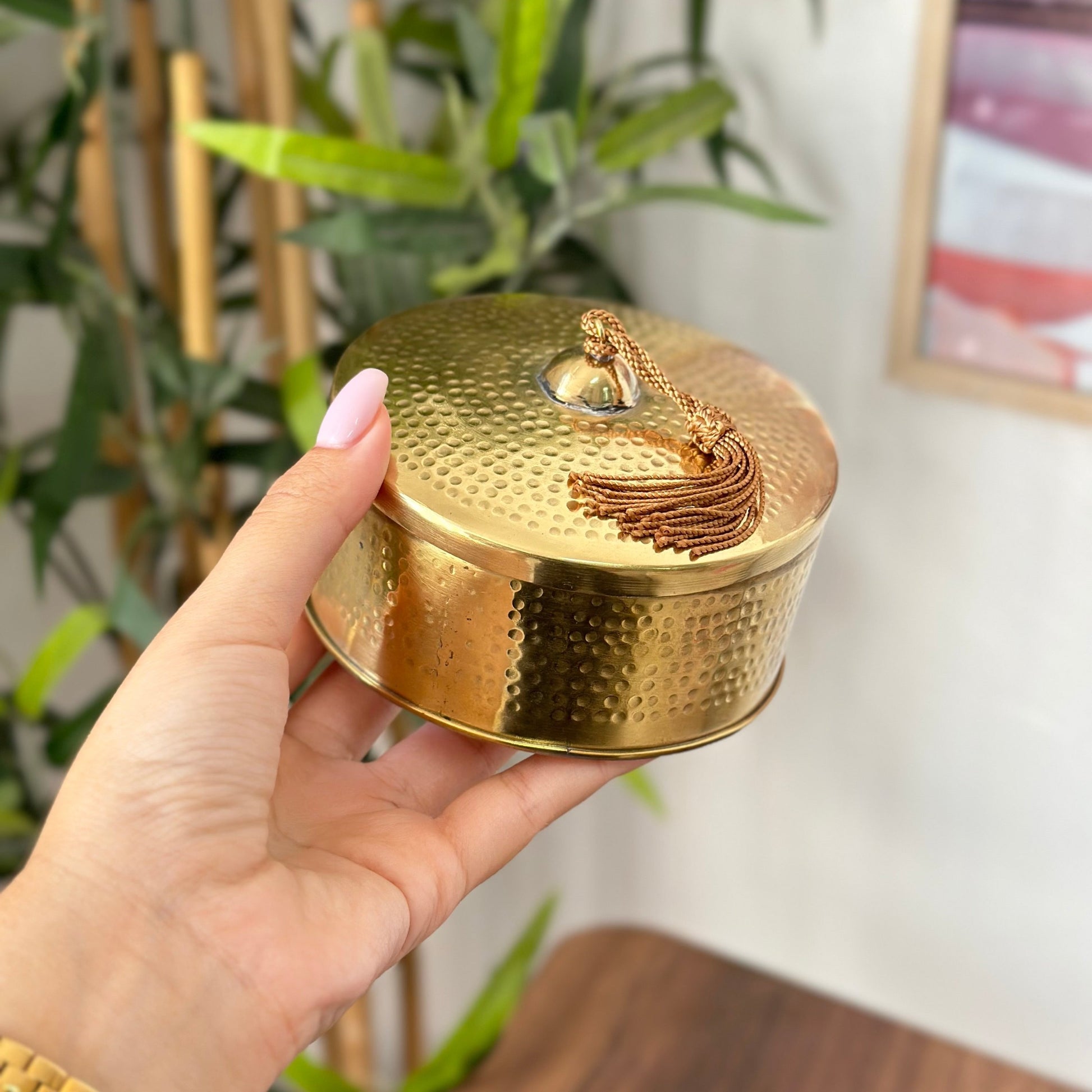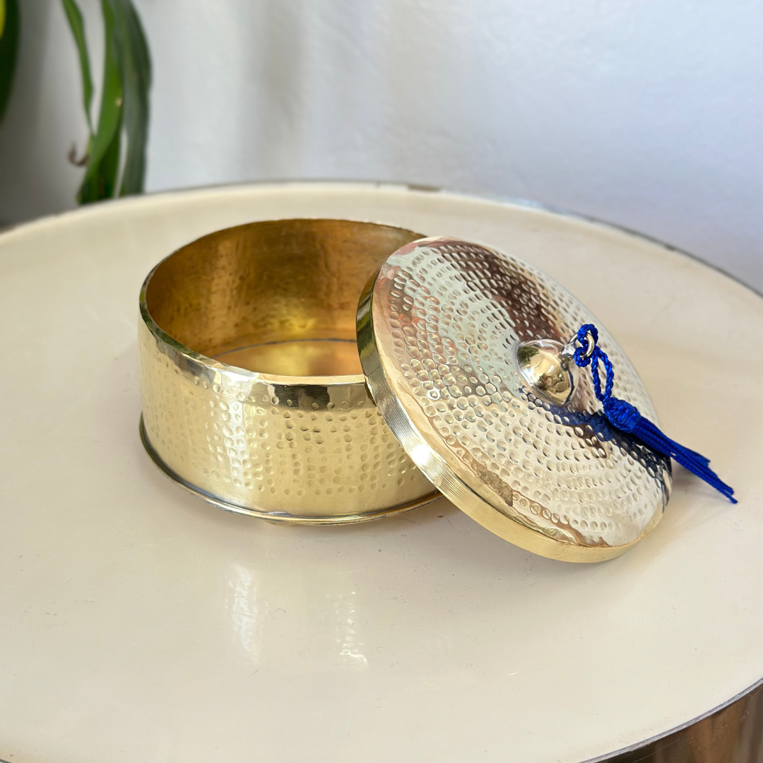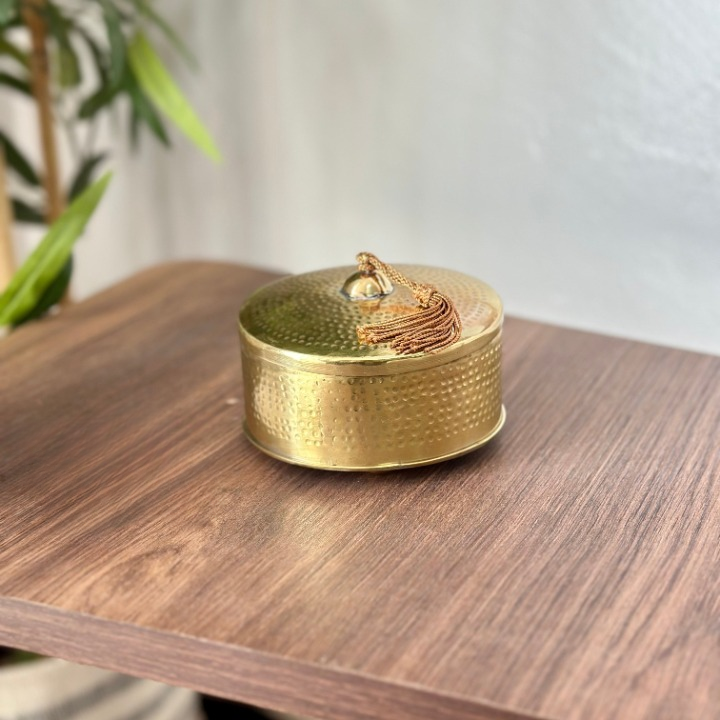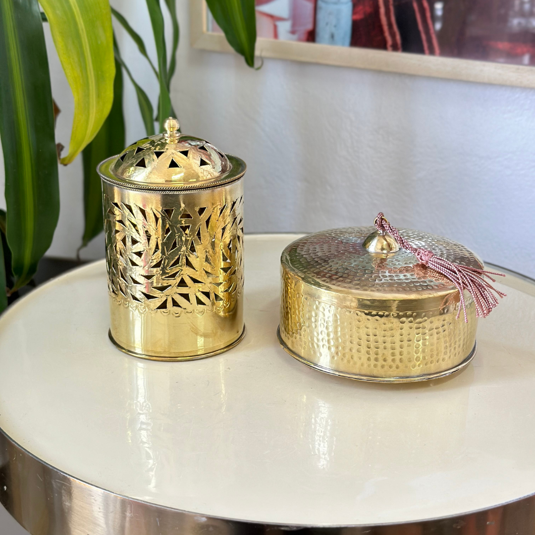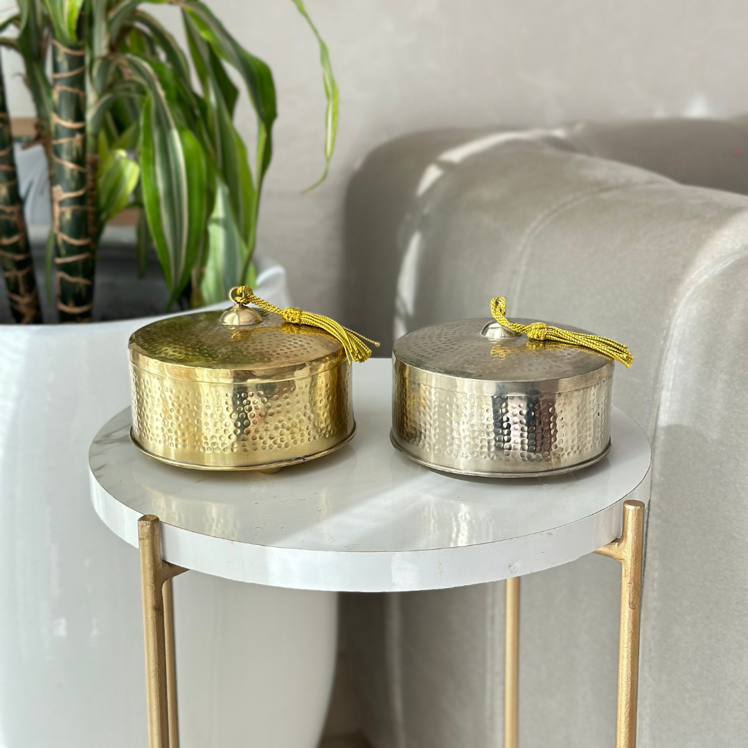 Sublimez votre décoration intérieure avec nos élégantes boîtes entièrement en laiton martelé, disponibles en finition dorée ou argentée. Chaque boîte est façonnée à la main par des artisans marocains, offrant un travail de martelage raffiné et unique.