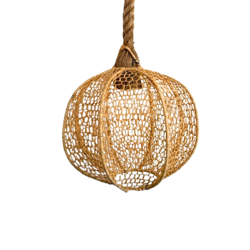 Cette suspension artisanale en fibres naturelles est une pièce lumineuse au design aérien et authentique, entièrement tressée à la main par des artisans marocains. Sa structure ajourée diffuse une lumière douce et chaleureuse, idéale pour créer une ambiance naturelle et apaisante.