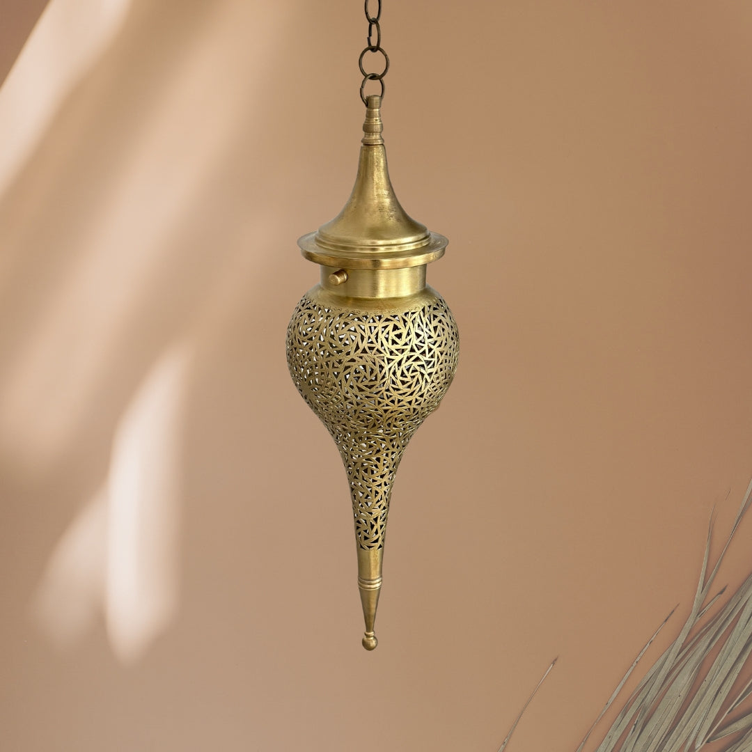 Apportez une touche d'élégance à votre intérieur avec la suspension en laiton Larme doré. Façonné à la main et poli pour un fini brillant, ce luminaire marocain apporte une lumière douce et chaleureuse à votre salon, entrée, cuisine ou chambre. Son design recourbé apporte une touche chic à votre décoration.