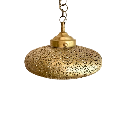 Apportez une touche de lumière traditionnelle et d’élégance marocaine à votre intérieur avec cette petite suspension en laiton doré ajouré, entièrement faite main par des artisans marocains. Ce plafonnier artisanal, aussi délicat que lumineux, allie savoir-faire ancestral et design épuré pour créer une atmosphère chaleureuse et authentique.