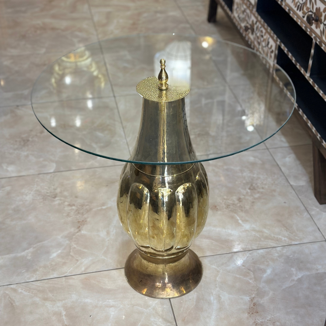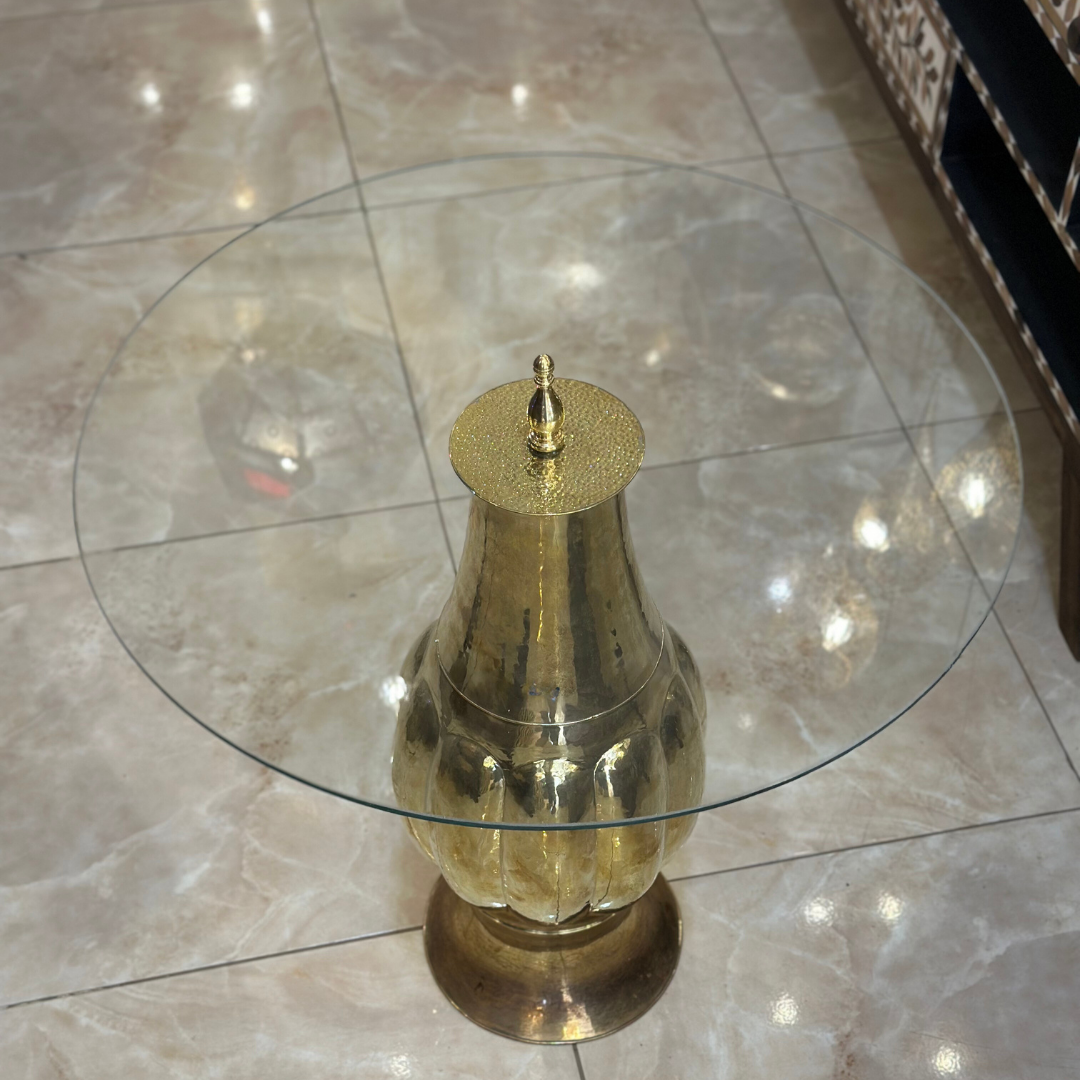 Cette table basse traditionnelle combine élégance et fonctionnalité avec son pied en laiton et son plateau en verre. Avec un diamètre de 60 cm et une hauteur de 60 cm, elle s'intègre facilement dans divers types d'intérieurs, apportant une touche sophistiquée et lumineuse. Le pied en laiton travaillé à la main souligne le savoir-faire marocain, tandis que le plateau en verre transparent met en valeur le design épuré de la table.