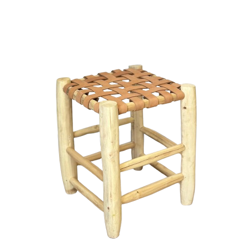Le tabouret moyen Tazrout est l’équilibre parfait entre authenticité et confort. Réalisé à la main, il marie la chaleur du cuir camel tressé à la noblesse du bois brut, dans un style à la fois rustique et élégant.