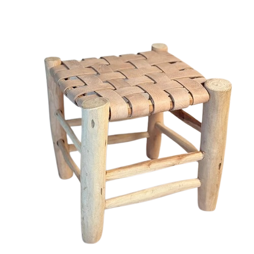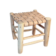 Tabouret artisanal Tazrout en bois et cuir beige petit