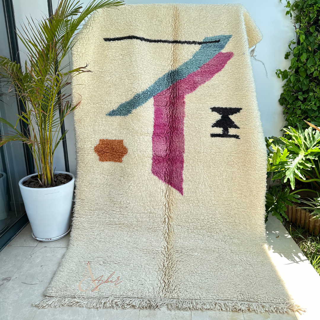 Découvrez ce Tapis Mrirt, une pièce d'exception venue tout droit de la région de Khenifra au Maroc. Fabriqué à la main par des femmes talentueuses, ce tapis est confectionné en pure laine, garantissant une douceur et une durabilité incomparables.