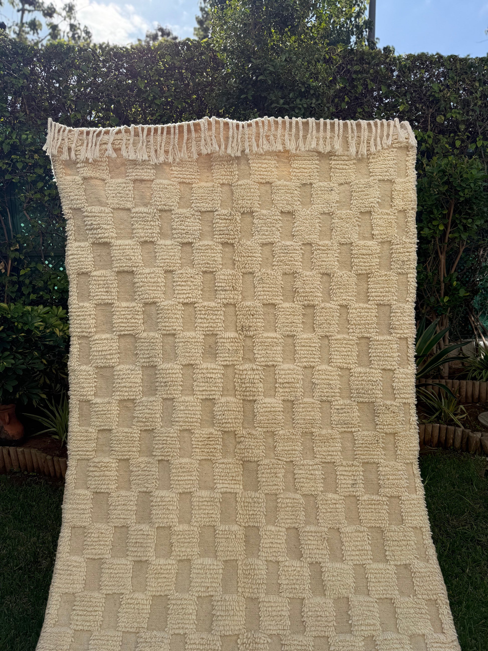Apportez chaleur, authenticité et élégance à votre intérieur avec ce tapis berbère Azilal 100 % laine de mouton, entièrement tissé à la main au Maroc selon un savoir-faire ancestral. Sa teinte crème naturelle, douce et lumineuse, s’intègre harmonieusement dans tous les styles d’intérieur : bohème chic, minimaliste, contemporain ou esprit riad.
