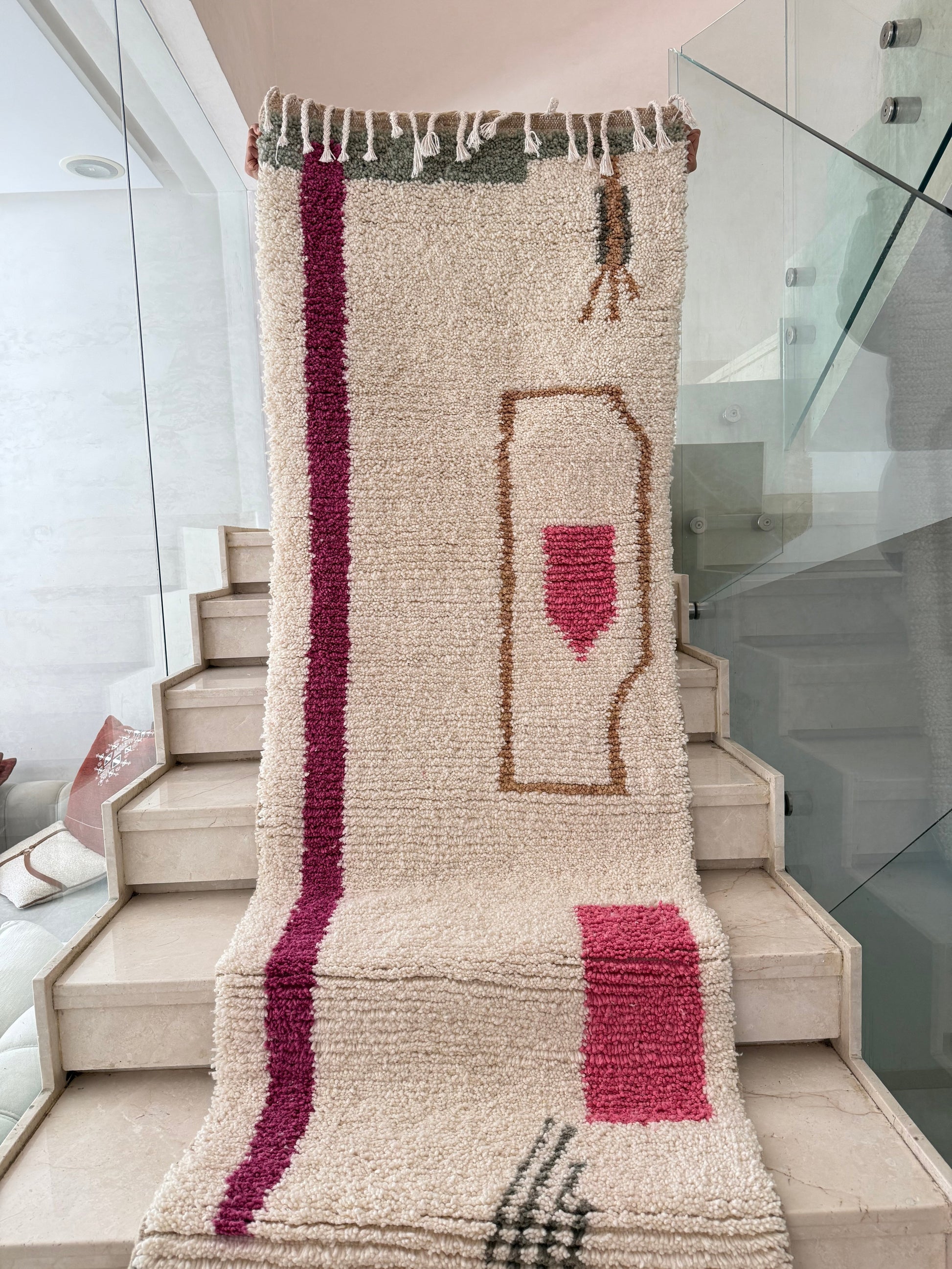 Tapis Berbère Runner Azilal 100% Crème, Fushia et gris en Laine De Mouton- 2,86m /79cm