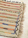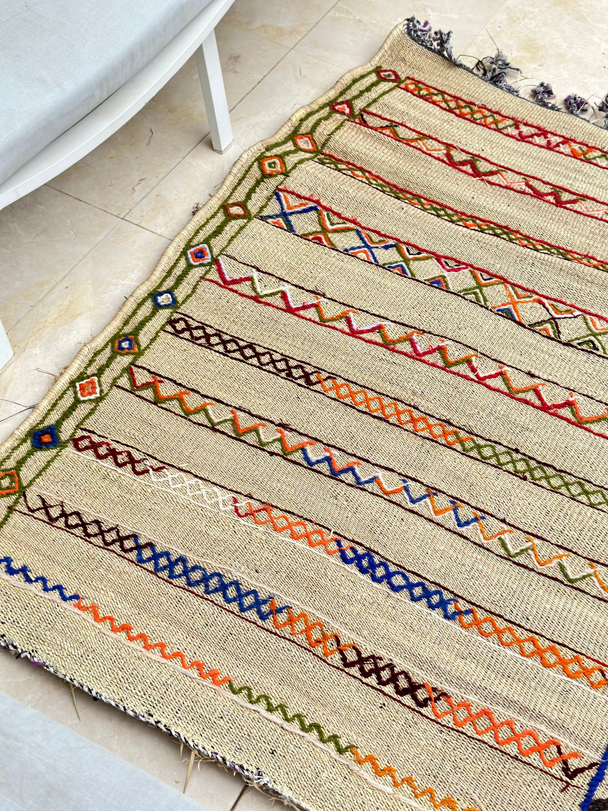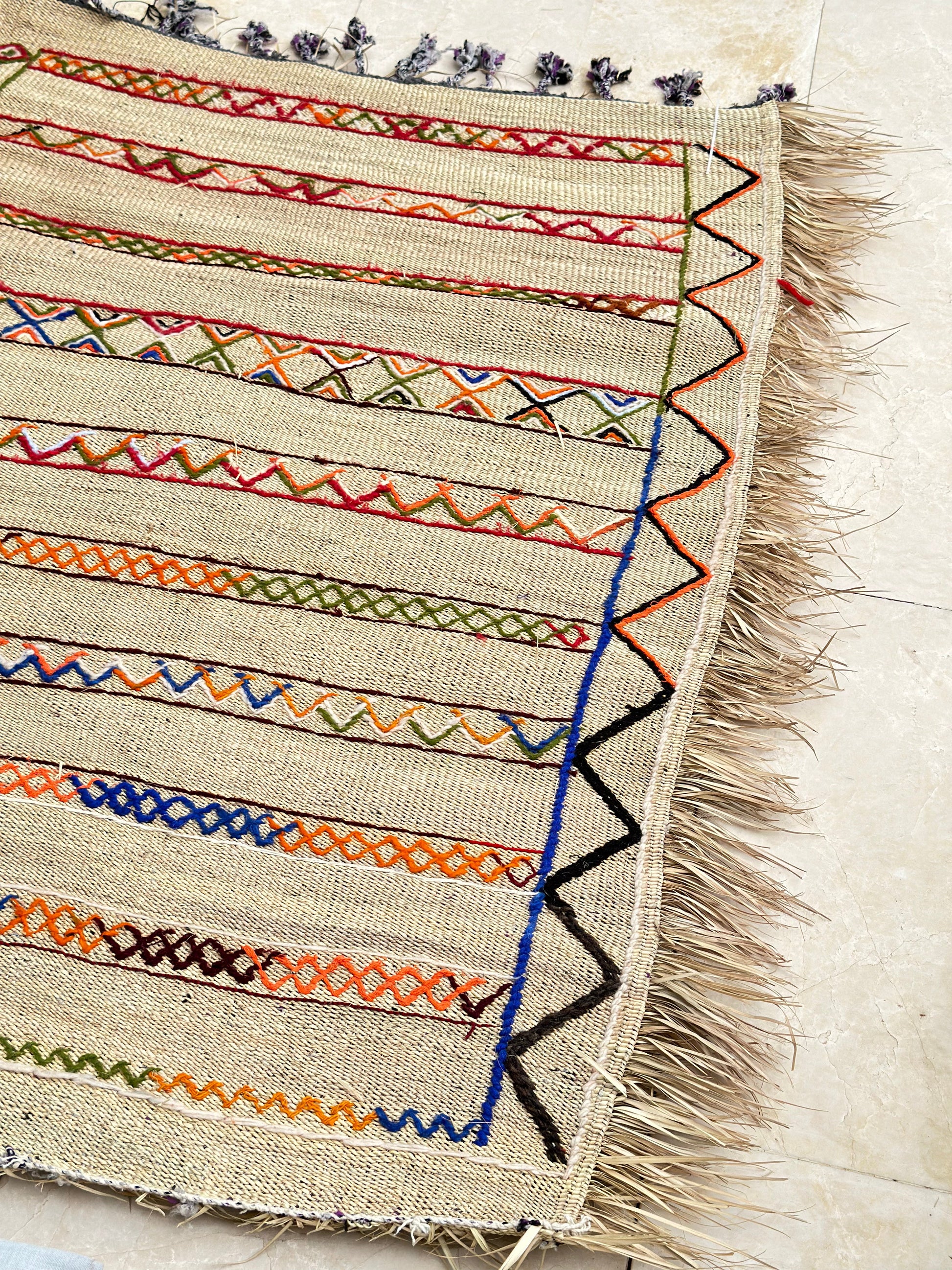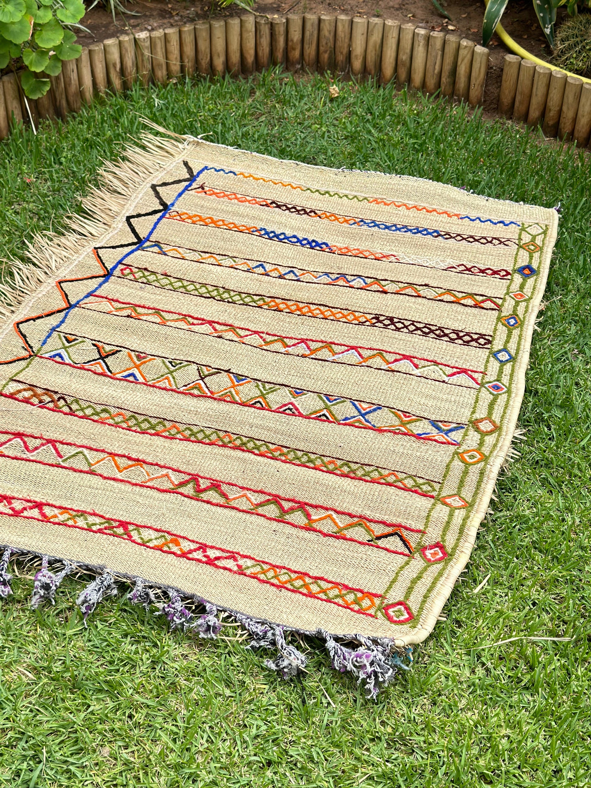 Ce tapis d'extérieur en osier (Hssira) agrémenté de magnifiques dessins en fil de laine colorés faits à la main par des artisanes de la région de Khmisset apportera une touche d'authenticité à votre espace extérieur. Fabriqué à partir de matériaux de qualité et éco-responsables, ce tapis est à la fois résistant et esthétique. Idéal pour créer une ambiance chaleureuse et conviviale en plein air.