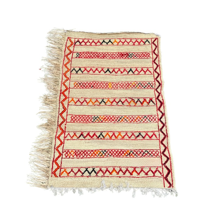 Ce tapis d'extérieur en osier (Hssira) agrémenté de magnifiques dessins en fil de laine rouge et noir faits à la main par des artisanes de la région de Khmisset apportera une touche d'authenticité à votre espace extérieur. Fabriqué à partir de matériaux de qualité et éco-responsables, ce tapis est à la fois résistant et esthétique. Idéal pour créer une ambiance chaleureuse et conviviale en plein air.