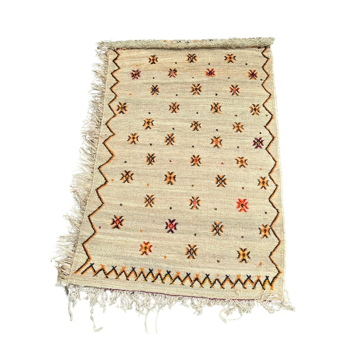 Ce tapis d'extérieur en osier (Hssira) agrémenté de magnifiques dessins en fil de laine orange et noir faits à la main par des artisanes de la région de Khmisset apportera une touche d'authenticité à votre espace extérieur. Fabriqué à partir de matériaux de qualité et éco-responsables, ce tapis est à la fois résistant et esthétique. Idéal pour créer une ambiance chaleureuse et conviviale en plein air.
