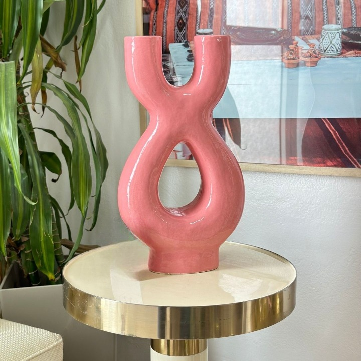 Apportez une touche artistique audacieuse à votre intérieur avec ce vase design en céramique, disponible en rose ou en vert. Véritable sculpture contemporaine, ce vase ajouré séduit par ses lignes organiques et son style architectural. Son design en forme de sablier revisité avec une ouverture centrale lui donne une allure sculpturale unique, parfaite pour devenir la pièce maîtresse de votre décoration.